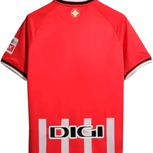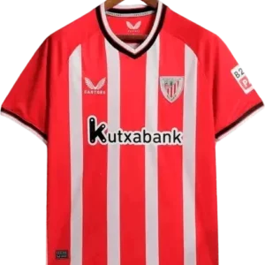 La camiseta local del Athletic 2023/24, fabricada por Castore, recupera las clásicas franjas rojiblancas con un diseño donde las franjas rojas presentan mayor grosor y las mangas en rojo liso; cuello redondo, escudo aplicado y detalles de remate que homenajean la historia del club. Es una pieza retro y vintage muy cotizada por coleccionistas. La lucieron jugadores destacados como Iñaki Williams, Iker Muniain, Nico Williams, Oihan Sancet y Unai Simón.