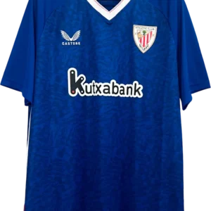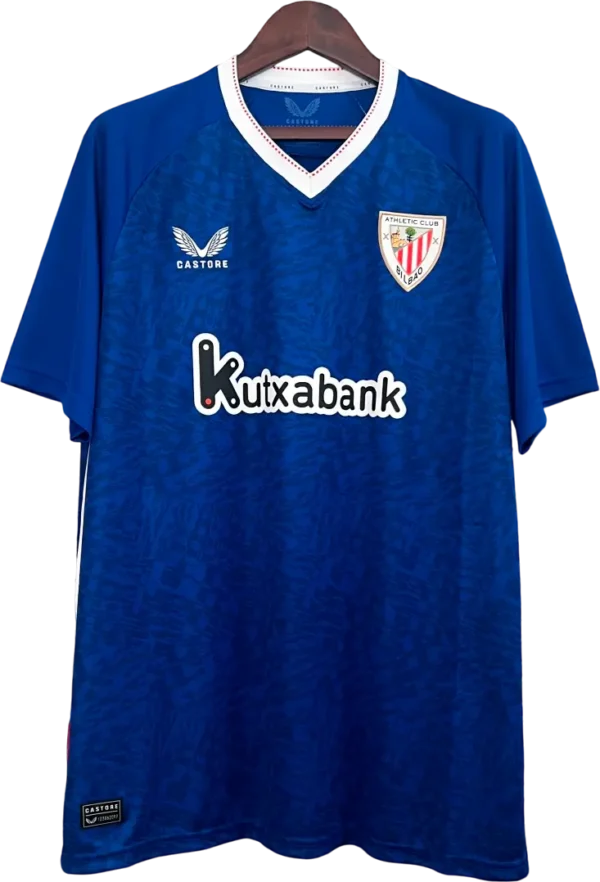 La camiseta visitante del Athletic 2024/25 (Castore) apuesta por un tono azul royal / “Bilbao blue” como color principal, con cuello y remates blancos y un ribete rojo que recuerda la paleta rojiblanca en los costados; corte técnico AerTek, tejido de ventilación y escudo tejido en el pecho. Es una pieza retro y vintage reinterpretada en clave moderna y disponible en tienda oficial. La vistieron referencias del primer equipo como Iker Muniain, Iñaki Williams, Nico Williams, Oihan Sancet y Unai Simón.
