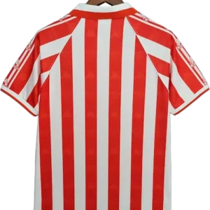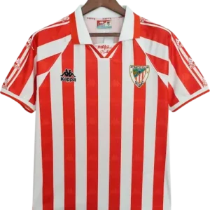 La camiseta local del Athletic 1995-97, fabricada por Kappa, recupera las clásicas franjas rojiblancas verticales con cuello redondo y remates sencillos; tejido ligero de la época, escudo aplicado y ausencia de sponsor frontal (era una equipación sin publicidad comercial en cancha); estética sobria y fiel al lienzo tradicional del club. Es una pieza retro y vintage muy cotizada por coleccionistas. La lucieron jugadores destacados como Julen Guerrero, Joseba Etxeberria, Cuco Ziganda, Ismael Urzaiz y Aitor Karanka.