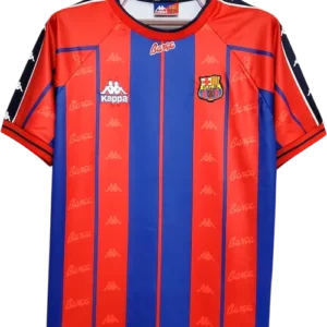 La camiseta local del FC Barcelona 1997-98 presentó el clásico diseño azul y grana con franjas verticales, cuello redondo y el patrocinio de Kappa, una de las más icónicas de los 90. Es una camiseta retro y vintage muy recordada porque el Barça ganó el doblete: Liga y Copa del Rey, con figuras como Rivaldo, Luis Enrique y Guardiola, quedando grabada como símbolo de una temporada muy exitosa.