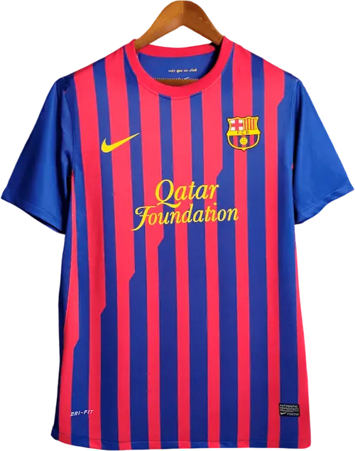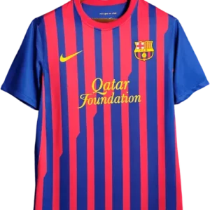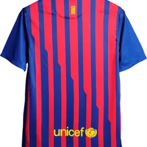 La camiseta local del Barça 2011-12, diseñada por Nike, presenta las clásicas franjas verticales azul y grana con cuello en “V” y un corte moderno y ligero, representando la identidad tradicional del club con un toque contemporáneo. Es una camiseta retro y vintage muy valorada por coleccionistas, utilizada por jugadores emblemáticos como Lionel Messi, Xavi, Andrés Iniesta, Carles Puyol y David Villa, pilares del equipo durante esa temporada.