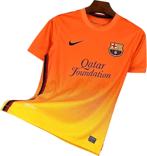 La camiseta visitante del Barça 2012-13, en tonos naranja y amarillo, diseñada por Nike, combina un estilo llamativo y moderno con detalles azulgrana en cuello y mangas, ideal para los partidos fuera de casa. Es una camiseta retro y vintage muy apreciada por coleccionistas, utilizada por jugadores emblemáticos como Lionel Messi, Xavi, Andrés Iniesta, Carles Puyol y Cesc Fàbregas, pilares del equipo en esa temporada.
