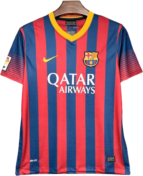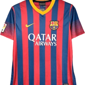 La camiseta local del Barça 2013-14, diseñada por Nike, presenta las clásicas franjas verticales azul y grana con cuello redondo y un diseño moderno y ligero, representando la identidad tradicional del club con un estilo contemporáneo. Es una camiseta retro y vintage muy apreciada por coleccionistas, utilizada por jugadores emblemáticos como Lionel Messi, Xavi, Andrés Iniesta, Neymar y Dani Alves, figuras clave del equipo en esa temporada de transición.