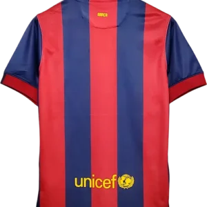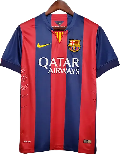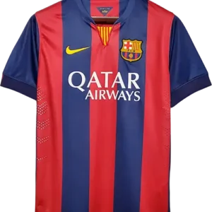 La camiseta local del Barça 2014-15, diseñada por Nike, mantiene las clásicas franjas verticales azul y grana con cuello redondo y un corte moderno y ligero, representando la identidad tradicional del club con un toque contemporáneo. Es una camiseta retro y vintage muy apreciada por coleccionistas, utilizada por jugadores emblemáticos como Lionel Messi, Luis Suárez, Neymar, Andrés Iniesta y Xavi, pilares del equipo durante la temporada del histórico triplete.