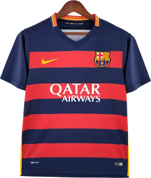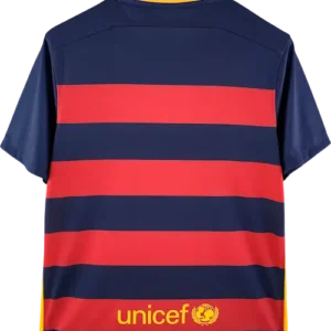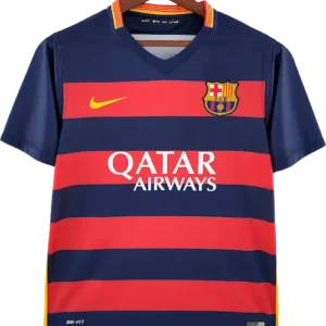 La camiseta local del Barça 2015-16, diseñada por Nike, mantiene las clásicas franjas verticales azul y grana con cuello redondo y un corte moderno y ligero, representando la identidad tradicional del club con estilo contemporáneo. Es una camiseta retro y vintage muy valorada por coleccionistas, utilizada por jugadores emblemáticos como Lionel Messi, Luis Suárez, Neymar, Andrés Iniesta y Sergio Busquets, pilares del equipo en esa temporada.