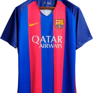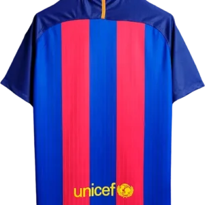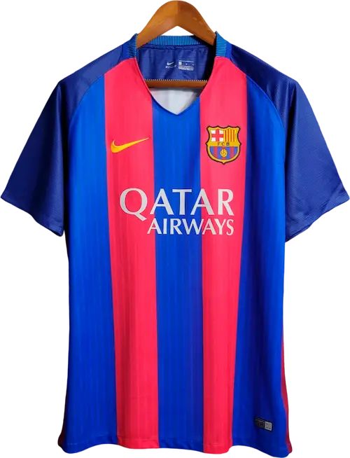 La camiseta local del Barça 2016-17, diseñada por Nike, mantiene las clásicas franjas verticales azul y grana con cuello redondo y un diseño moderno y ligero, representando la identidad tradicional del club con un estilo contemporáneo. Es una camiseta retro y vintage muy valorada por coleccionistas, utilizada por jugadores emblemáticos como Lionel Messi, Luis Suárez, Neymar, Andrés Iniesta y Sergio Busquets, pilares del equipo durante esa temporada.