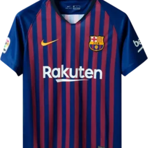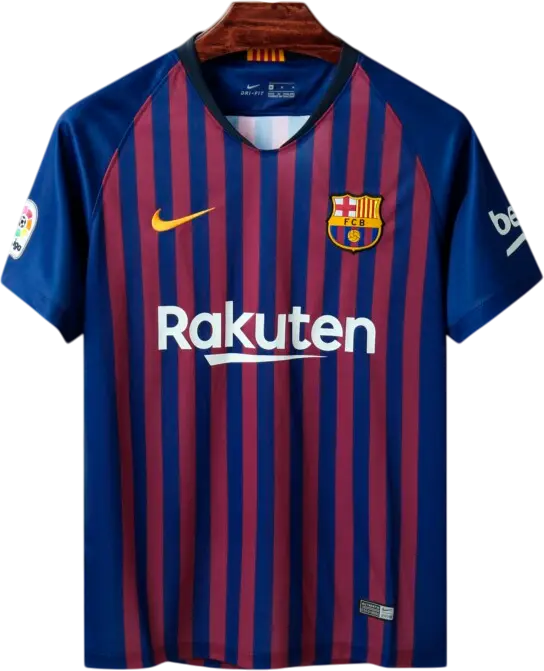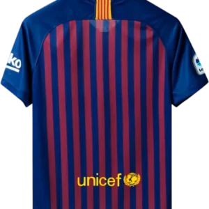 La camiseta local del Barça 2018/19, diseñada por Nike, mantiene las clásicas franjas verticales blaugrana (10 franjas en homenaje a los 10 distritos de la ciudad) con cuello redondo y un acabado moderno y ligero; incorpora pequeños detalles amarillos en el cuello y las mangas que le dan un toque contemporáneo. Es una pieza retro y vintage muy valorada por coleccionistas y aficionados; la llevaron jugadores icónicos como Lionel Messi, Luis Suárez, Gerard Piqué, Sergio Busquets y Jordi Alba.