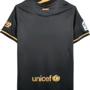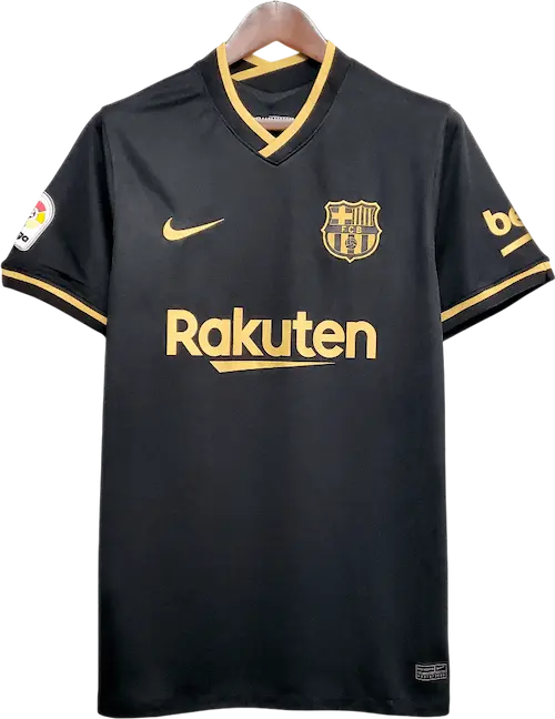 La camiseta visitante del Barça 2020/21, fabricada por Nike, apuesta por un fondo negro con detalles dorado en logos, ribetes y tipografías, creando un aspecto elegante y premium pensado para competir fuera del Camp Nou. Presenta un corte técnico y acabado suave, con el patrocinador principal integrado en el frontal y pequeños guiños estéticos que la convierten en una pieza retro y vintage muy apreciada por coleccionistas. La vistieron jugadores icónicos de aquella plantilla como Lionel Messi, Antoine Griezmann, Ousmane Dembélé, Ansu Fati y Frenkie de Jong.