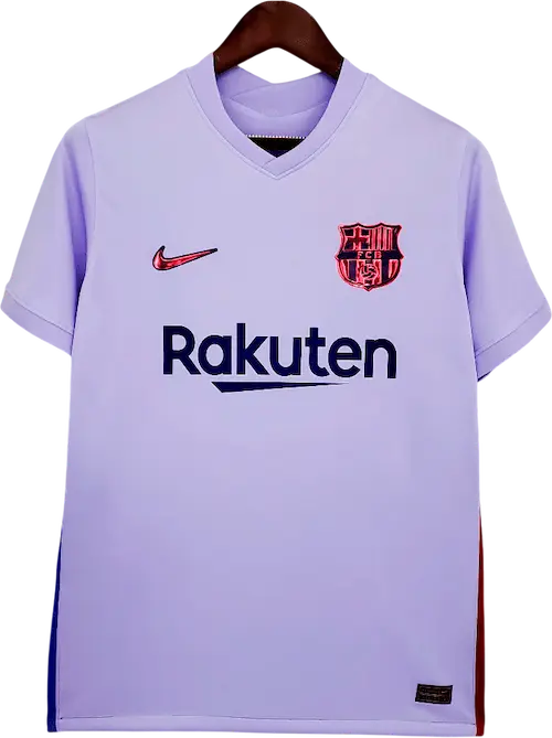 La camiseta visitante del Barça 2021/22, fabricada por Nike, apuesta por un tono lila/púrpura (purple pulse) con logos irisados y franja azulgrana + grana en los costados; el diseño incorpora mensajes de unidad y guiños a la igualdad de género en algunos detalles. Es una pieza retro y vintage muy cotizada por coleccionistas. La lucieron jugadores destacados como Pedri, Frenkie de Jong, Ansu Fati, Memphis Depay y Gerard Piqué.